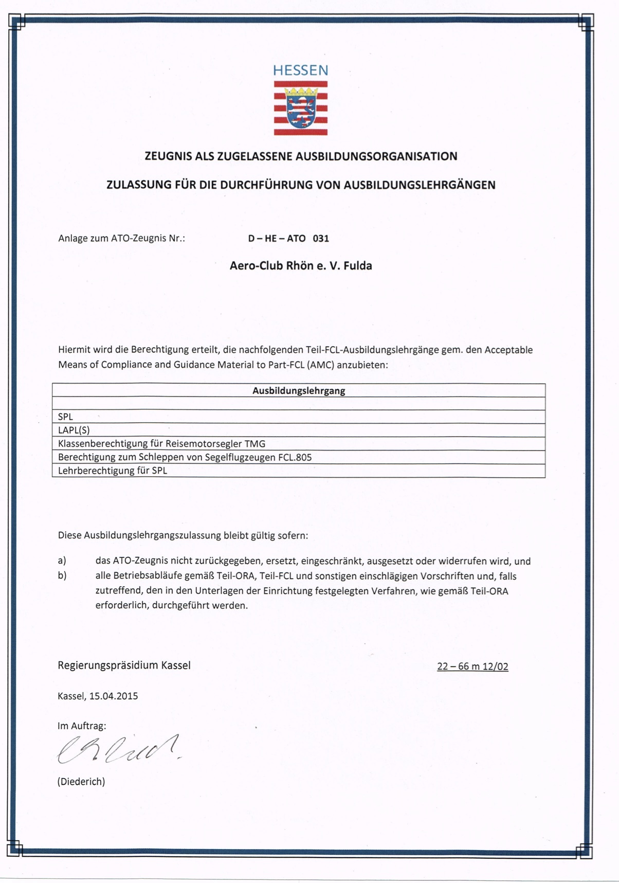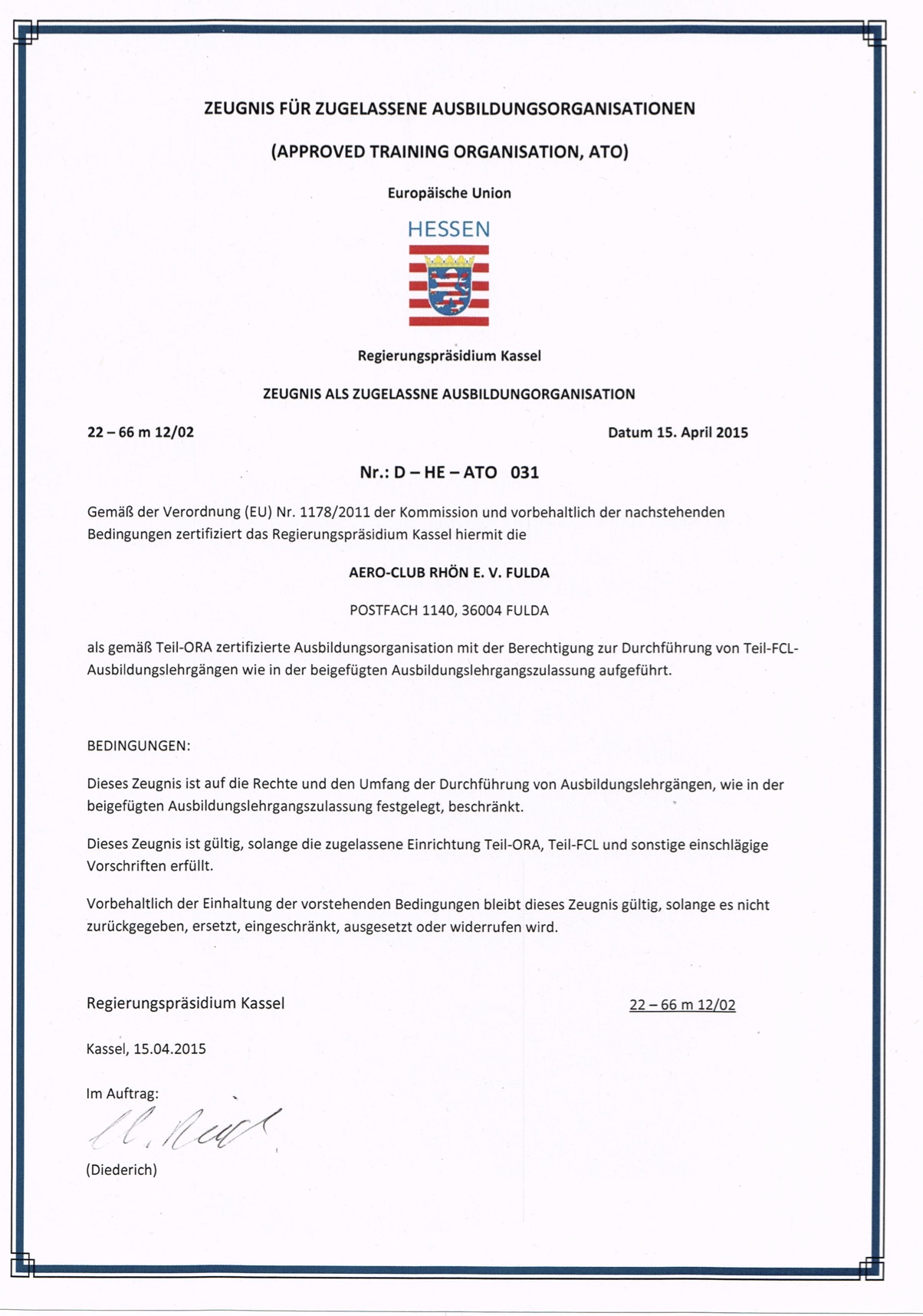 Gemäß § 28 LuftPersV i.V.m. ARA.GEN.310 der Verordnung (EU) Nr. 290/2012 der Kommission vom 30.03.2012 zur Änderung der Verordnung (EU) Nr. 1178/2011 zur Festlegung technischer Vorschriften und von Verwaltungsverfahren in Bezug auf das fliegende Personal in der Zivilluftfahrt gemäß Verordnung (EG) Nr. 216/2008 des Europäischen Parlamentes und des Rates erteilt uns das Regierungspräsidium Kassel die Ausbildungserlaubnis als „Zugelassene Ausbildungseinrichtung“ ATO.
