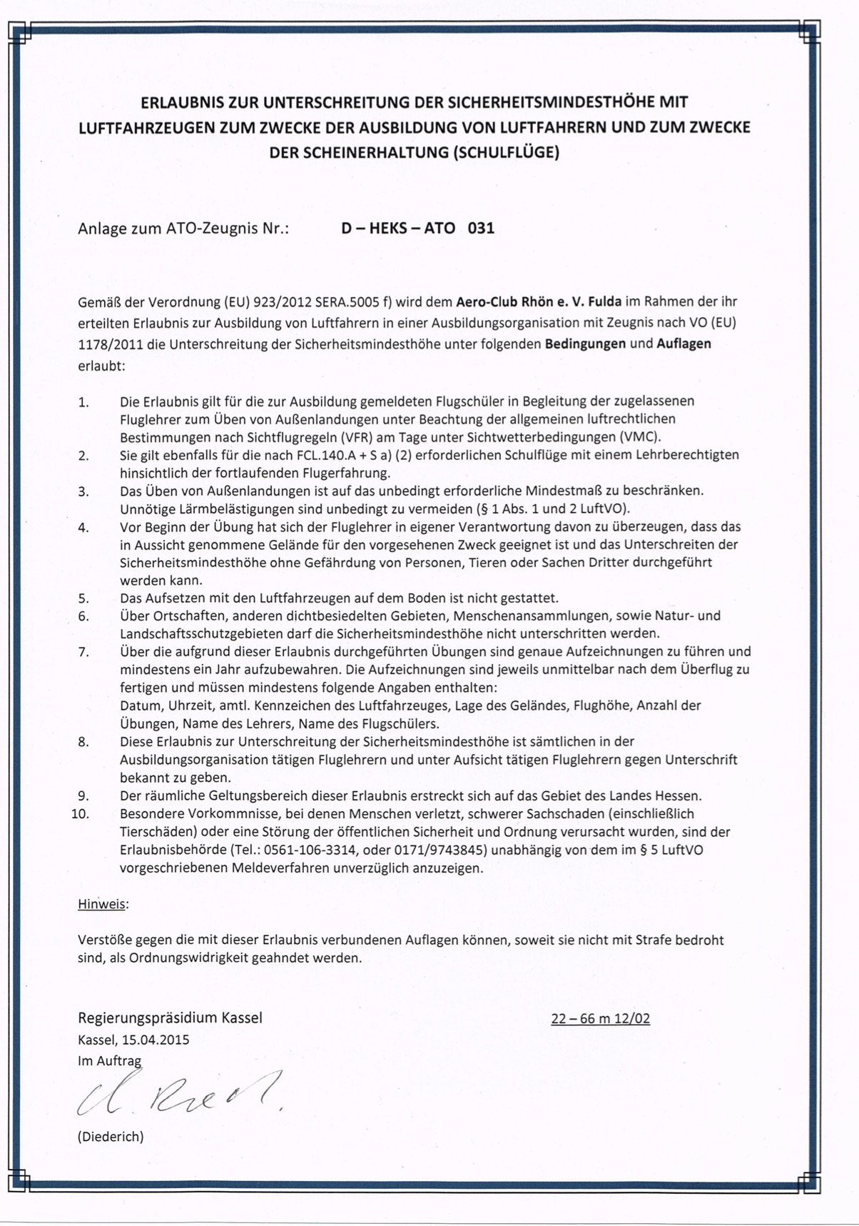 Weiterhin wurde uns die Erlaubnis zur Unterschreitung der Sicherheitsmindesthöhe mit Luftfahrzeugen zum Zwecke der Ausbildung von Luftfahren und zum Zwecke der Scheinerhaltung (Schulflüge) erteilt.
