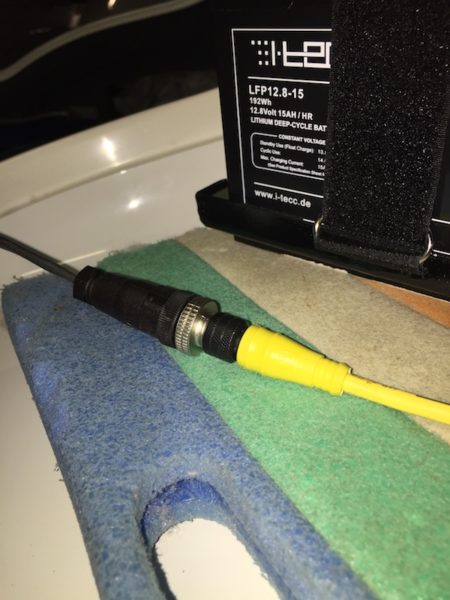 Damit der relativ teuere Akku lange lebt, wurde das Anschlußstecker-System in der ASK-21 umgerüstet. Der neue Stecker ist verpolungssicher und nur das neue LiFePO4-Ladegerät kann an den neuen Akku angeschlossen werden (die alten Blei-Ladegeräte dürfen nicht für die LiFePO’s verwendet werden). Es handelt sich um sogenannte Industrie-M12-Rundstecker. Diese werden durch Verschrauben gesichert. Bitte mit 1-2 vollen Umdrehungen verschrauben, bis die Rasterung fühlbar wird. Dann ist der Anschluß vibrationssicher hergestellt und kann im Flug nicht mehr aufgehen.